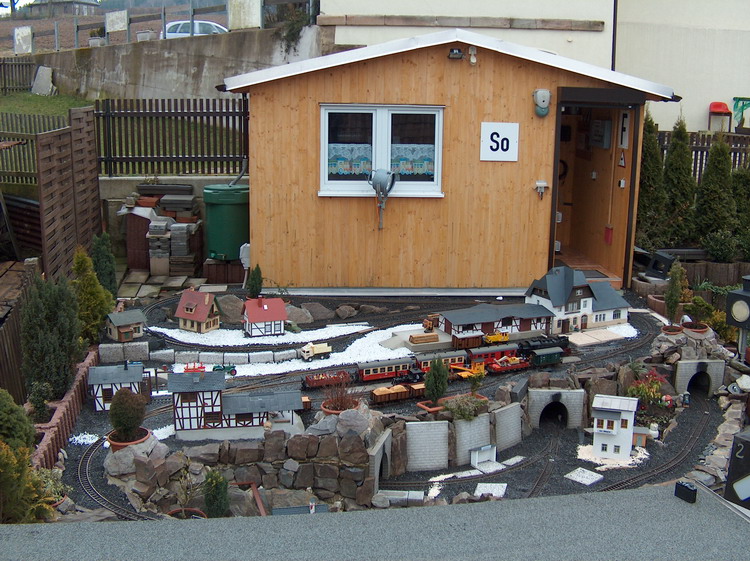 Außenansicht des Stellwerkes und Teil der Gartenbahn-Anlage